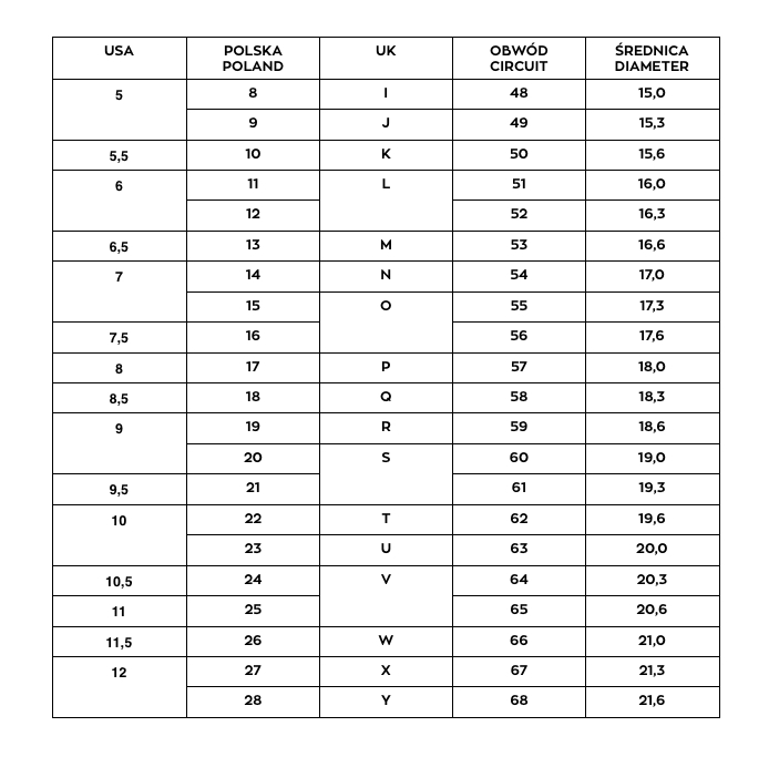 Tabela rozmiarów pierścionków